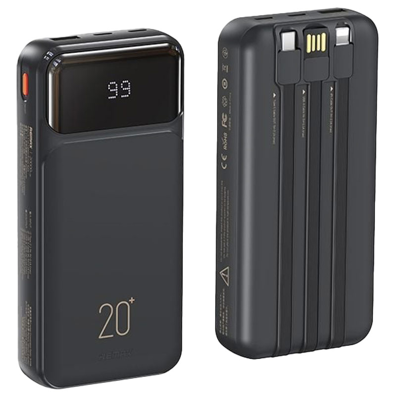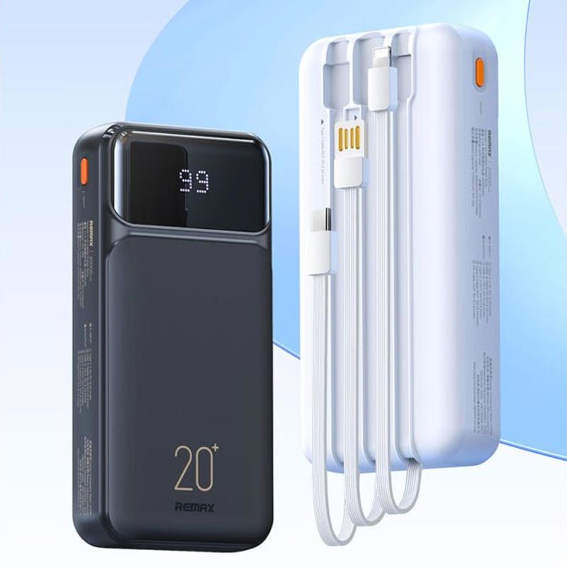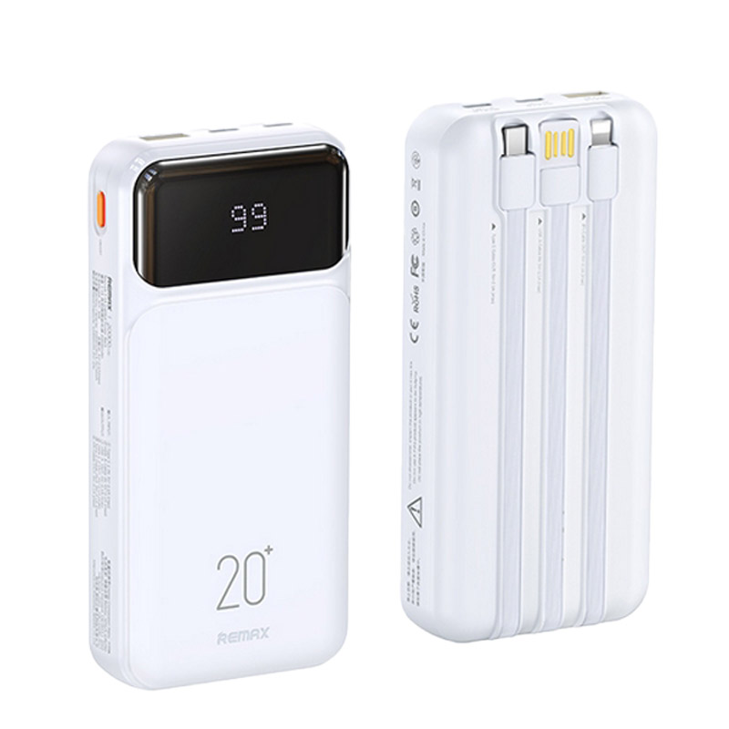 Ruiyi 2.1A Mobile Power with Cord 1. Product color: Dark Night Black, Moonlight White 2. Battery capacity: 20000mAh 3. Rated energy: 20000mAh/3.7V/74Wh 4. Rated capacity: 11000mAh (5V-2A) 5. Input voltage: TYPE-C1 (near the outer port) Input: 5V -2.1A (Max) Comes with line A input: Supports DCP/BC1.2 input (this input line is not included in the black TYPE-C line and cannot be used simultaneously) Input: 5V-2.1A (Max 10.5W) 6. Output voltage: USB: 5V -2.1A (Max) Type-C2 (intermediate port): 5V -2.1A (Max) Type-C comes with built-in cable output: 5V/2.1A (Max) IPH built-in cable output: 5V-2.1A (Max) Total output: 5V-2.1A (Max) 7. Energy conversion rate: ≥ 65% 8. Product Material and Process: ABS+PC V0 Fireproof 9. Bare machine size: 144 * 69 * 30 10. Bare weight: 416g